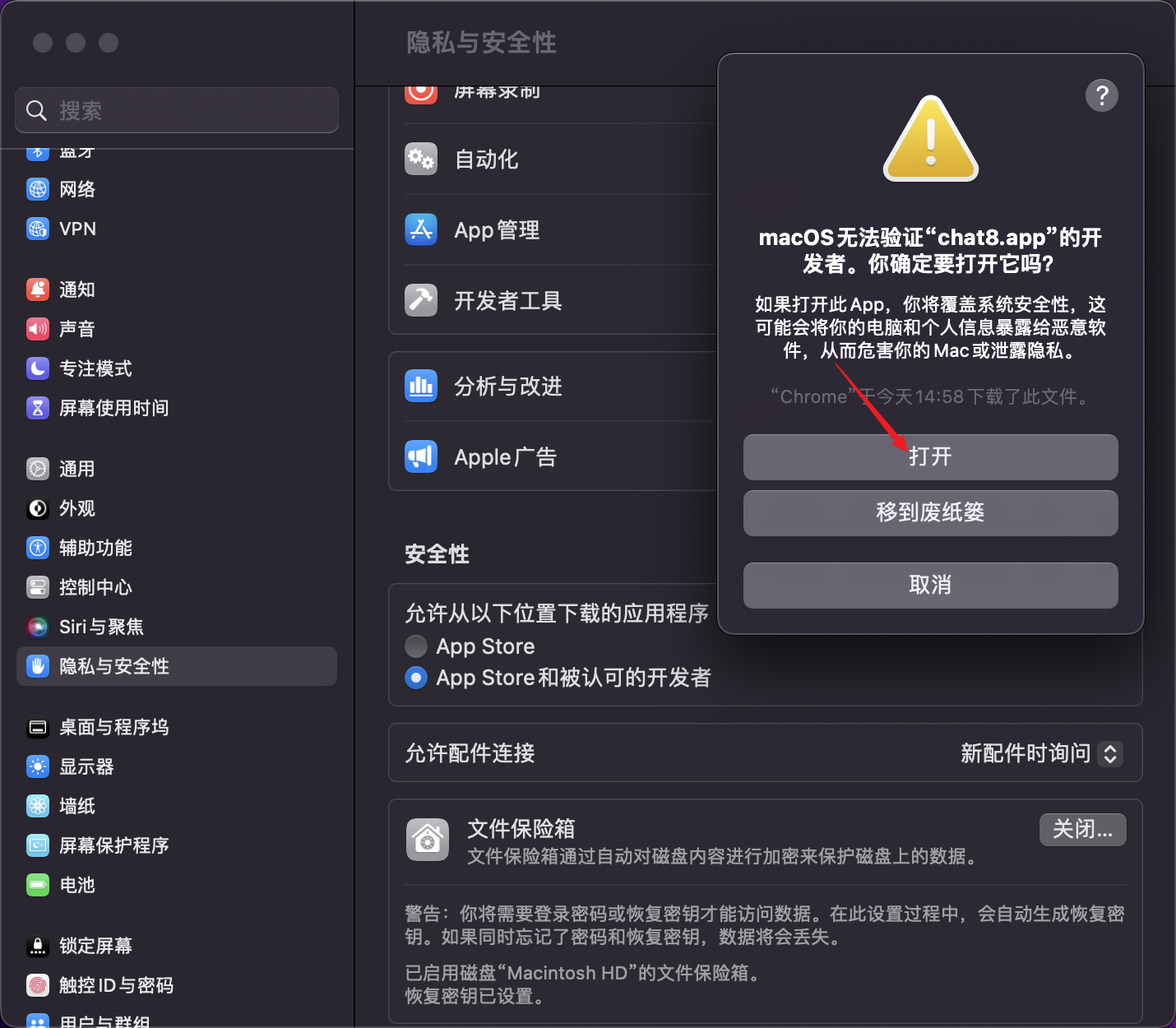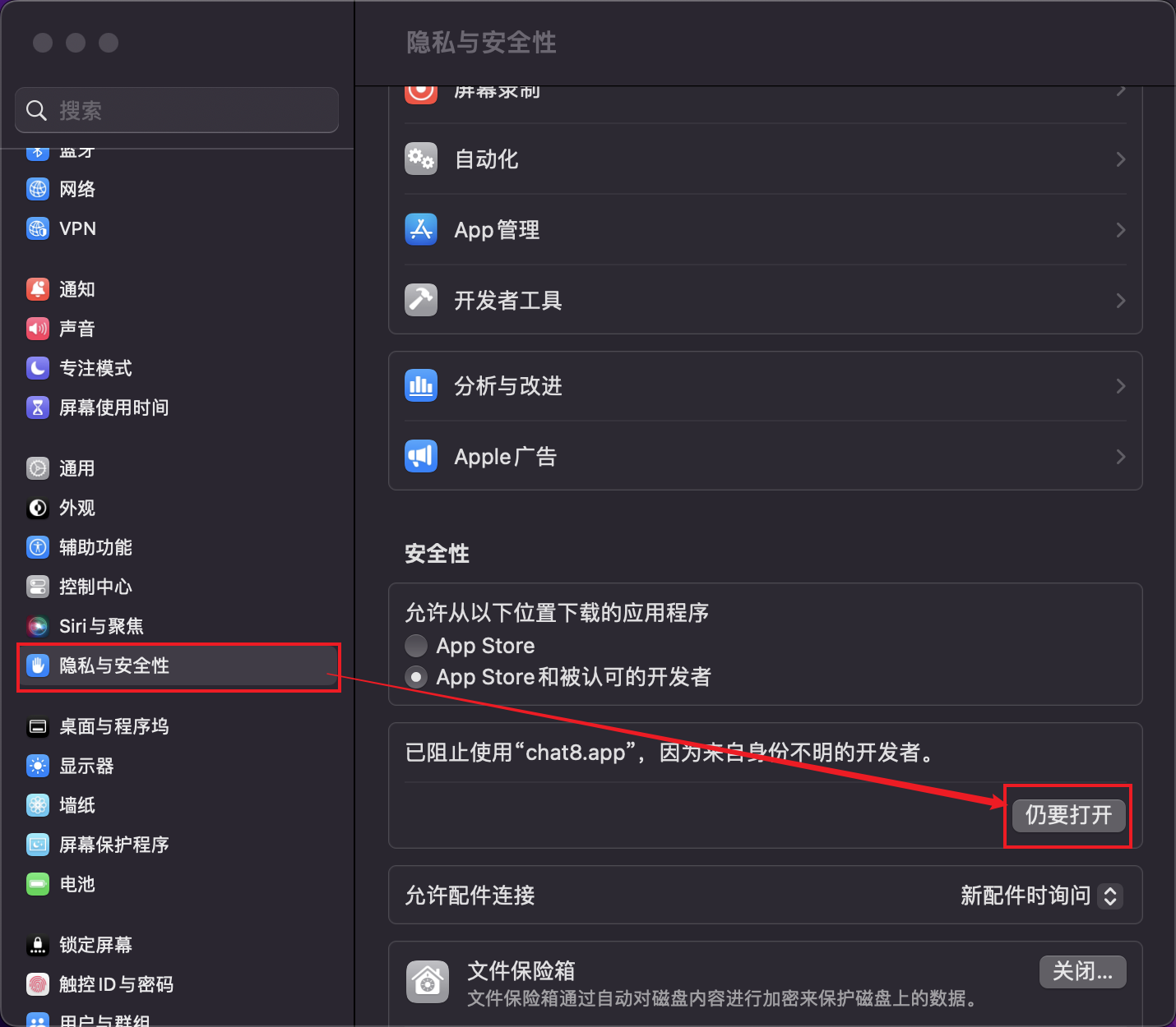第四步:找到“隐私与安全性”设置,下拉找到‘已阻止使用“chat8.app’,因为来自不明的开发者。”,点击“仍要打开”